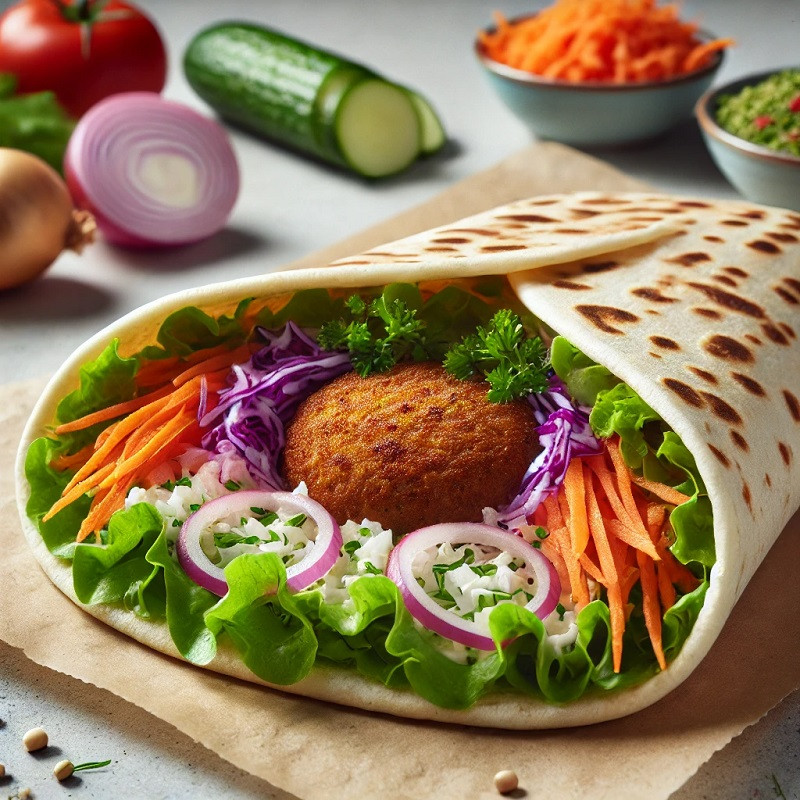 Indulge in our delightful Vegan Wrap, a perfect blend of flavors and textures wrapped in a toasted flatbread that is both dairy and yeast-free. For those with dietary preferences, our flatbread can also be made gluten-free or low-carb. Choose from Falafel or Mujvar—or a combination of both—for the core of your wrap. This is complemented by fresh lettuce, crunchy carrot, zesty onion, vibrant red cabbage, and a generous serving of tabbouli. A smooth layer of hummus adds a creamy touch, making every bite a delicious experience. Customize your wrap with up to three of our signature vegan sauces to add the finishing touch to this wholesome and satisfying meal.