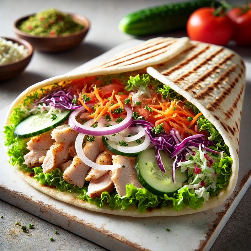 Indulge in our delectable gourmet kebab wrap, featuring succulent, diced grilled chicken or beef or Turkish meatballs. This mouth-watering wrap is packed with fresh, vibrant fillings including shredded lettuce, crisp shredded carrot, thinly sliced onions, and tangy sliced red cabbage, complemented by a generous serving of tabbouleh. All these delightful ingredients are carefully wrapped in a dairy and yeast-free toasted flatbread, ensuring a wholesome and satisfying meal. Enhance your experience with up to three of our signature sauces.