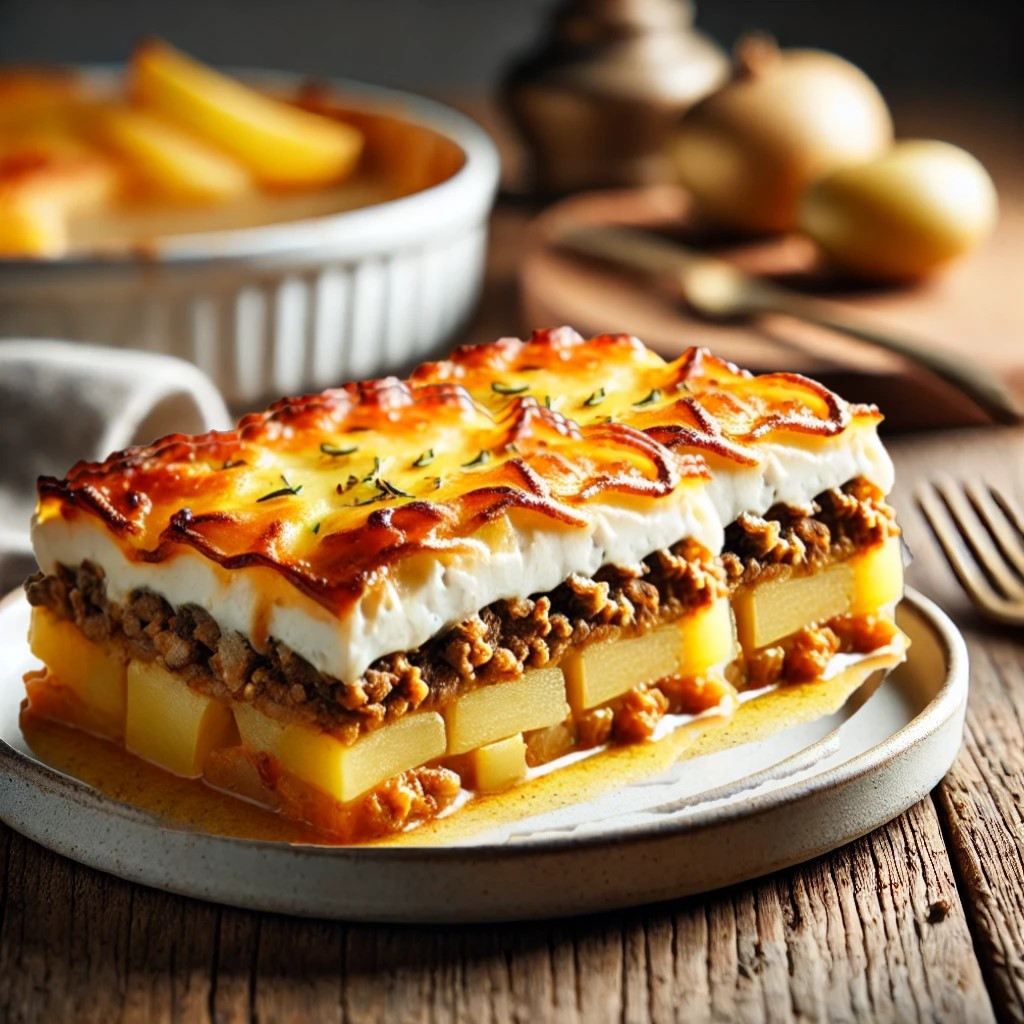Moussaka is a delicious and comforting dish with layers of tender potatoes, savory lamb mince infused with aromatic spices, succulent tomatoes, and onions, all topped with fried eggplant. The crowning glory is a generous drizzle of velvety béchamel sauce and a layer of melted cheese, creating a perfect harmony of flavors and textures.