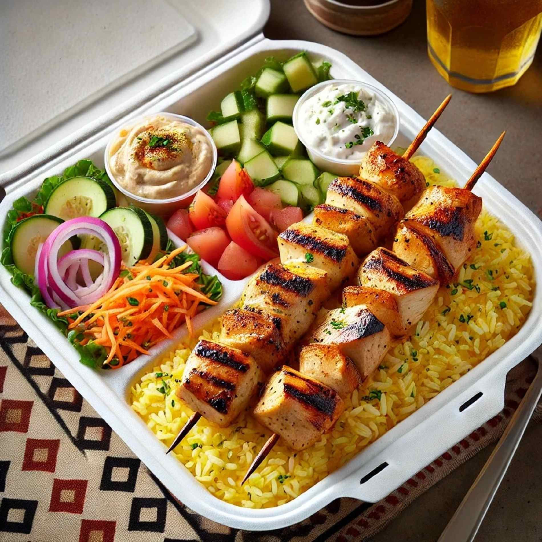 Indulge in a hearty and flavorful dish with your choice of succulent grilled chicken, juicy beef, traditional Turkish meatballs, or a mixed grill combination. Served on a base of fluffy rice, crisp salad, or golden fries, this dish is a feast for the senses. Enjoy it with a fresh and colorful salad mix of lettuce, diced tomato, cucumber, carrot, onion, and red cabbage, along with vibrant tabbouleh, creamy hummus, and cool, refreshing tzatziki. Top it off with your choice of three delicious sauces to create a personalized and mouthwatering experience.