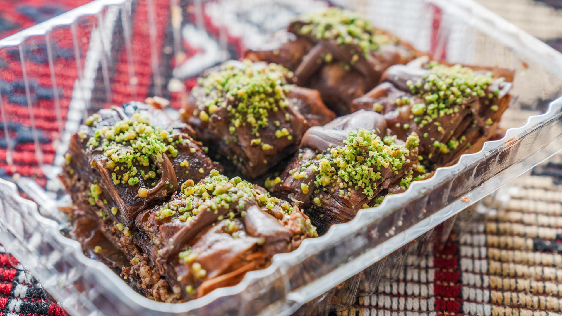 Indulge in our decadent Chocolate Baklava, elegantly presented in a convenient container featuring six perfectly crafted, chocolate-infused pieces. Each layer showcases delicate, buttery phyllo dough enveloping a sumptuous blend of premium walnuts and pistachios, subtly spiced and sweetened with syrup and rich chocolate. Baked to golden perfection, this classic Mediterranean dessert offers a harmonious balance of flaky textures and luxurious flavours. Whether sharing with friends or enjoying a personal treat, our Chocolate Baklava is a timeless delight that ensures every bite is pure bliss.
